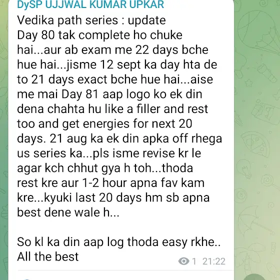 वेदिका दर्पण — DySP उज्जवल कुमार उपकार एवं टीम का एक प्रयास है जो सभी अभ्यर्थियों को नि:शुल्क और गुणवत्तापूर्ण शिक्षा प्रदान करने के लिए समर्पित है। हमारा उद्देश्य है कि आर्थिक रूप से कमजोर छात्र भी BPSC, BSSC और बिहार दरोगा जैसी प्रतियोगी परीक्षाओं की तैयारी श्रेष्ठ शिक्षकों के मार्गदर्शन में कर सकें। जब शिक्षा एक व्यवसाय बन चुकी है, तब वेदिका दर्पण एक आंदोलन है समान अवसर और सच्चे ज्ञान के लिए। यहाँ मेहनत, अनुशासन और सही दिशा से हर सपना साकार हो सकता है।