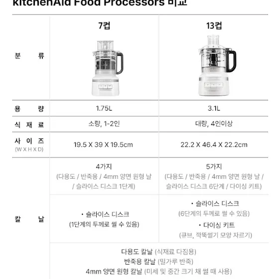 게다가 깍둑썰기 칼날, 6단계 슬라이스 두께 조절 기능, 3가지 사이즈 푸셔, 전용 뚜껑 구성품 포함 혜택은 13컵에만! ✨무엇보다 모터 파워가 압도적으로 13컵이 강력합니다