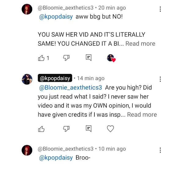 So, recently I made a video about babymonster twerking issue, and โช@Rosรฉluvberriesโฌ uploaded the same type of video before me, which was posted on 17th july and mine was posted on 24th july, But the point is that I never watched her video, Why would I give credits to someone when I didn't even took or got inspired by their idea? It was my own opinion and I made a video about it, I never knew she made the same type of video before me, but I would have given her credits if I was inspired by her because giving credits isn't that hard but that thing is that I WASN'T. And โช@Bloomie_aexthetics3โฌ Dear, Idc if you are rosรจberrieluvs's alt or something, I already told you I didn't copy her and I did freaking research for my video so stop being a brat and what's with your threats "Give credits otherwise things won't get good" You think you look cool while saying that? You're not tuff bro๐ฅ. Pls accept that out of 8 billion people in the world, two people can HAVE the same idea. Consider READING IT PROPERLY and Reply logically cuz you always reply with your 6th grade comeback. (click to see full pic)