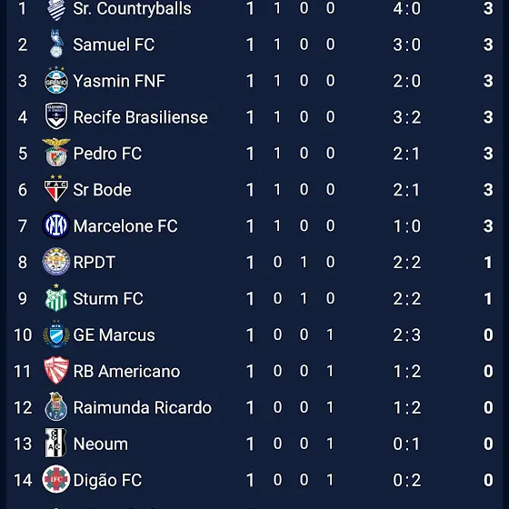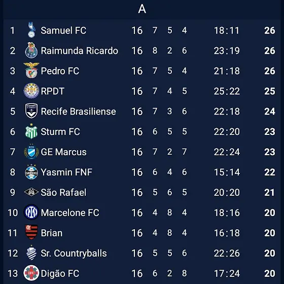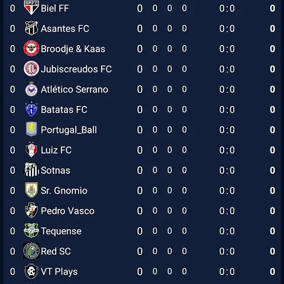 FSF (Federação Samuel de Futebol):SFL1:- @samuhsant Oldham / RS- @jogodotigrinhosolatodos Bordeaux / PE- @GabrielSantos-w6r6d Porto / RJ- Lobo Guará Ferroviário / CE- @rpdt2012 Pulga EC / Pará- @rbamericano8768 São Luiz / RS- @ShibaZitu Benfica / RJ- @HedgehogSupreme22 Mixto / MT- @Yasmin_FNF1903 Grêmio / RS- @ArthurOliveiraOFC12 Uberlândia / MG- @RBdigaofc Ipatinga / BA- @Neoumzin1 Campo Grande / RJ- @Brian724 Flamengo / RJ- @Marcus MTK Budapest / SP- @Sr.Countryballs4405 CSA / AL- @Marcelonecounty12965 Internazionale/GOSFL2:- @trabalha_logo575 Leônico / BA- @Asantesec14 - Ceará / CE- @vascudo310 Operário Ferroviário / PR- @RomeroFcbrasileiro9 Escudo Próprio / SP- @Sr.Gnomiozin Uruguai / PE- Frankfurt EC - Manchester United / BA- Caio - Atlético Três Corações/MG- VT Plays - Remo/PA- @lucasdeespigaodooeste (LC FC) - Tocantinópolis / TO- @Italy1908 (Red SC) - Real Mamoré / GO- Sotnas - Santos/SP- Broodje & Kass - Brentford/SC- @Portugalball-1909 - Aston Villa/MS- @rubronegrosempre1895 (Luiz FC) - Joinville/RN- @1_LUV_GHOSTFORCE_4ND_ZAK_STORM (Zak Storm Super Pirate) - Nova Iguaçu / PR- @Casa-p6v (Batatas FC) - Paysandu / PA- @PedroVasco1898 - Vasco da Gama /RJ- @ClubeAtléticoSerranoES - Próprio / ES- @TequenseECT1932 - Sete FC / CE- @MayconGamesSoccer_ (Maycon Foot Ball Club) - Democrata GV / MGINSCRIÇÕES FECHADAS! MAS SE VOCÊ QUISER SE INSCREVER, AINDA PODE, PORÉM TERÁ QUE ESPERAR MAIS 4 TIMES ENTRAREM PARA PODER PARTICIPAR.