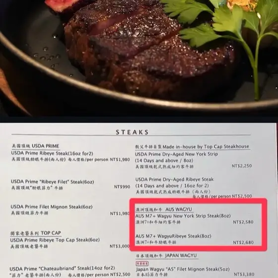 外面高檔餐廳、如前米其林連續六年一星餐廳「教父牛排」之前選用澳洲和牛M7+ 8盎司227g🥩紐約客$2580🥩肋眼$2680(1公斤大約1萬1千五百元)