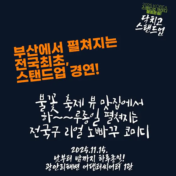 2025 KOREA 스탠드업 코미디 챔피언십!〈닥치고 스탠드업>11월 15일 불꽃축제는 거들뿐!! 전국 웃음 괴물들 총집합😂 단 하루! 광안리 해변 옆 어댑터씨어터 1관에서! 낮부터 밤까지 미친 텐션의 스탠드업 마라톤 코미디💥 저녁엔 광안리 불꽃축제까지🎆 📍 장소 : 광안리해변 어댑터씨어터 1관🕒 일정 예선 1회 13:30~14:30 2회 14:50~15:50 3회 16:10~17:10 4회 17:30~18:30 🔥 불꽃축제 19:00~20:00 🏆 파이널 20:30~22:00 🎟 지금 당장 예매: booking.naver.com/booking/12/bizes/847563/items/71…✨ 이 행사를 위해 부산광역시가 무려 불꽃 축제 협찬🔥 👏 다음 세대 코미디언들의 전설의 첫 페이지. 직접 목격할 사람? 바로 너. 부산이 웃음 성지 되는 순간, 놓치지 마라😎#스탠드업코미디 #코스챔 #코스챔2025 #부산코미디클럽 #부산불꽃축제