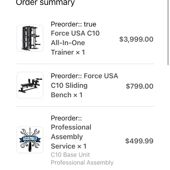 The Force USA C10, Sliding Bench and Professional Assembly Service ordered.