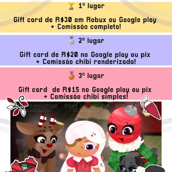 • 3º lugar: Gift card R$15 (Google Play/Pix) + comissão chibi simples