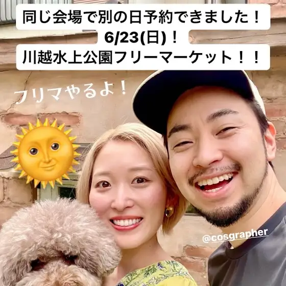 動画でもお伝えしましたがこちらにもー!6月2日は雨天中止となり、23日に延期しましたので再度詳細載せときます🌼↓ ↓ ↓夫婦でフリマ出店します🧔♂️🐻2024年6月23日(日)9時〜【川越水上公園フリマ】会場:埼玉県立川越水上公園第二駐車場住所:埼玉県川越市大字池辺880アクセス:・車では…国道16号脇田新町交差点を秩父日高方面へ約3km。来場者専用無料駐車場有り🚗・電車なら…JR川越線西川越駅から徒歩15分雨天中止(開催判断は公園規則により当日行います)私はお洋服や靴などファッション系アイテムメインで持っていくよ〜!着物周りも持ってくかも👘むーくんはヘアアートの写真集や手作りおもちゃ持ってくそうです✨ぎりぎりまでお家の中整理して色々持ってくんで、雑貨とかもあるかも〜!みなさまエコバッグ持参でお願いしまーす!一応15時までらしいんだけど、お昼過ぎには撤退しちゃうお店多いみたいで、私たちも様子みながら何時まで居ようかな〜って感じです🤔午前中にフリマ来てもらって午後は川越観光が良いかと思います😚アクセス悪いとこでごめんね!来れる方はぜひ来てね〜🌼あ、もじゃはお留守番です🐶