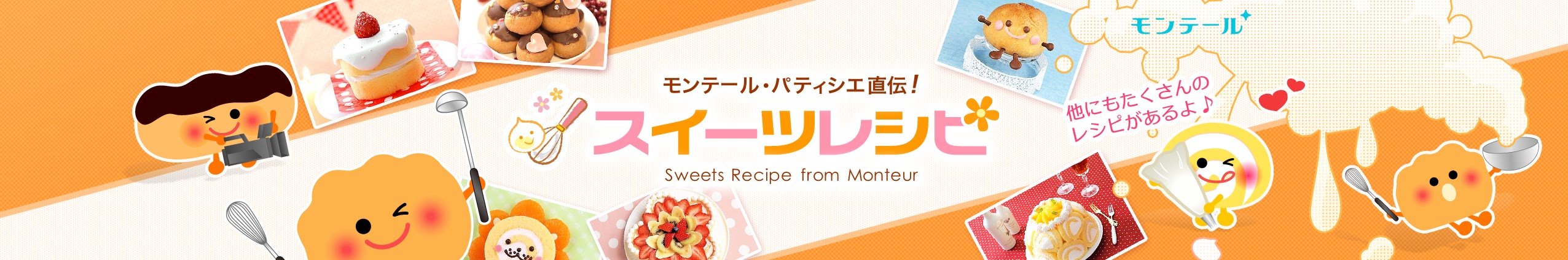 シュークリームやロールケーキなどを製造販売する洋菓子メーカー「モンテール」のパティシエ直伝!スイーツレシピ集。市販のスイーツをデコレーションした簡単なものから本格的なレシピまで幅広く紹介しています。