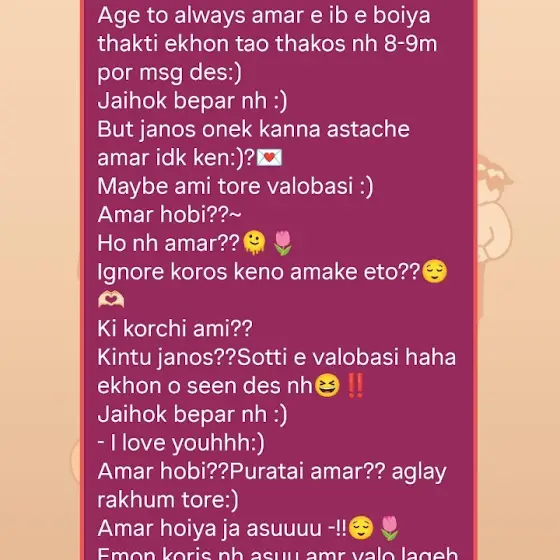Tumake hoytoh ar ami valobasi nah but ami tumar birthday er jonno onek din dhorei wait a chilam,tumi jano? Koto dream chilo but incomplete a hoyeh thakbe sarajibon tumar birthday the tumar bow hoye wish korbo vebe chilam but vagger ki pori hash tumar ex hoye wish korlam ❤️🩹🫶🏻