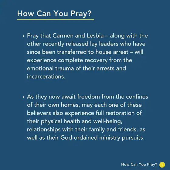 In an unexpected development, Carmen and Lesbia were among a small group of prisoners who were recently released from imprisonment. Even though no charges have been laid against the two women, they were placed under house arrest on November 29th. While this remains an unjust situation, the transfer marks a significant improvement following their prolonged incommunicado detention and solitary confinement. Sadly, several other Christian leaders who are classified as "political prisoners" remain incarcerated across the country.