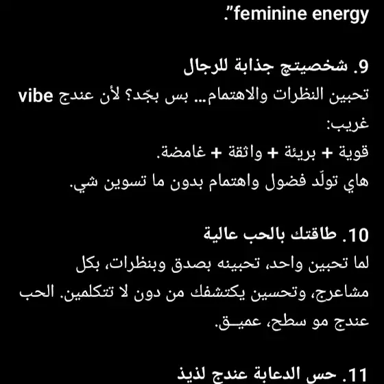 خل نحجي بصراحه اني انسانه احب اكون هاديه وغامضه وماريد اكون علاقات واحس هلشيء افضل وبنفس الوقت احب اكون اجتماعيه وعندي الف علاقه وما اسكت ف مرات اصفن ع نفسي واسوي الجو الي اريده هو هدوء واسمع ميتالز واقره كتب واحب المطر واريد اكون منعزله بس الناس عرفتني بأنو اني الاجتماعيه الي كلشوي ويا بنيه وحبوني بهل تصرفات مالتي والكل كام يحبني من ورا حركاتي ومجاي اكدر اطلع جوي الاصلي لأن احس اكو شيء بداخلي يمنعني ومجاي اعرف الطريق الصح يعني احب اكتفي بصديقه وحده فقط واني عندي اكثر من 8 صديقات وكلهن احبهن واعشقهن وماكدر بدونهن وبختصار اخاف من نظرة الناس أليه لان حيكولون مصطلح محرج يلي هو "كرنج". احب عالمي الخاص يلي بين الڤنتج والغموض الاحبه يعني عادي تكون حياتي سماعات، ميتالز،اضاءه صفره وايثنك 99% من الناس محتفهم شي لان كلامي مو مفهوم بس شنو يلي ببالي احجي،