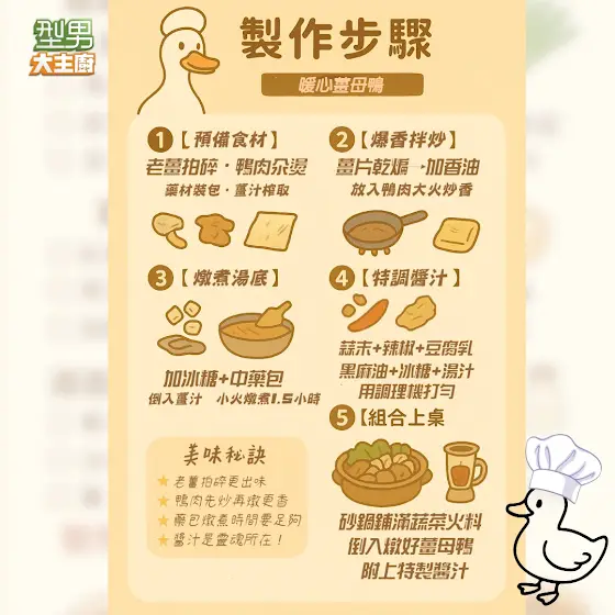 🦆🍲 天氣冷到發抖?在家自己煮薑母鴨!🎥 完整教學影片點這裡:https://youtu.be/9C0ESlrnAgk?si=bXhjO...這次把「薑母鴨圖文菜譜」整理好給大家了!想進補暖身的快跟著吳秉承師傅一起做!影片說明欄 也有詳細的文字介紹喔~冷天最適合來一鍋熱騰騰的薑母鴨,一起開煮吧🔥🫶💕現在加入會員就可以獲得圖片菜譜的原檔 💕以及許願下次要怎麼樣的菜譜✨小廚幫的會員 只要留下你的信箱 小編就會將菜譜原檔寄送給你~