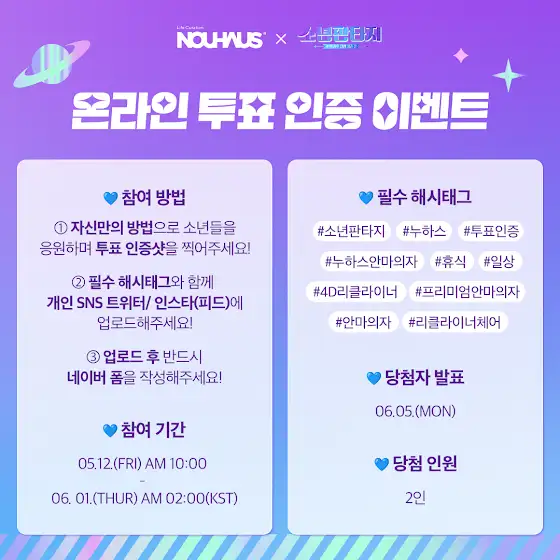 📌 참여 방법 : 1. 자신만의 방법으로 소년들을 응원하며 투표 인증샷을 찍어주세요 2. 필수 해시태그와 함께 개인 sns 트위터/인스타(피드)에 업로드 해주세요! 3. 업로드 후 네이버 폼을 작성해주세요! 3. 추첨을 통해 누하스 신제품 ‘4D 리클라이너 루나’ 제품을 드립니다.