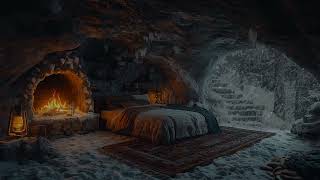 Unwind During a Snowstorm Night | Cozy Cave Fireplace Sounds & Calming Snow ASMR for Deep Relaxation