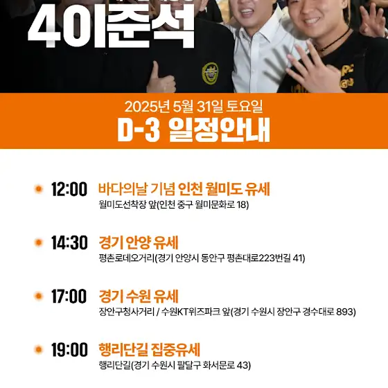 이준석 후보의 내일 일정입니다...인천을 시작으로 안양을 거쳐 수원으로 이어집니다...많은 분들의 응원과 성원이 필요합니다...판이 뒤집혔습니다...저의 예상대로 처음엔 이준석후보를 욕하다가...이제는 이재명에게로 화살이 가는중입니다...막판 대역전의 드라마...가능합니다!!!내일 뵙겠습니다!