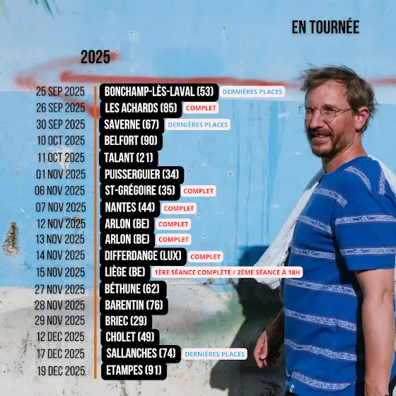 Salut! Voici les dates de tournée de mon spectacle, et les 4 jours à Bobino en décembre. J'espère bien vous y voir, et notamment à Aix-en-Provence, Sanary, Belfort et Talant, parce que ça bouge pas des masses...
