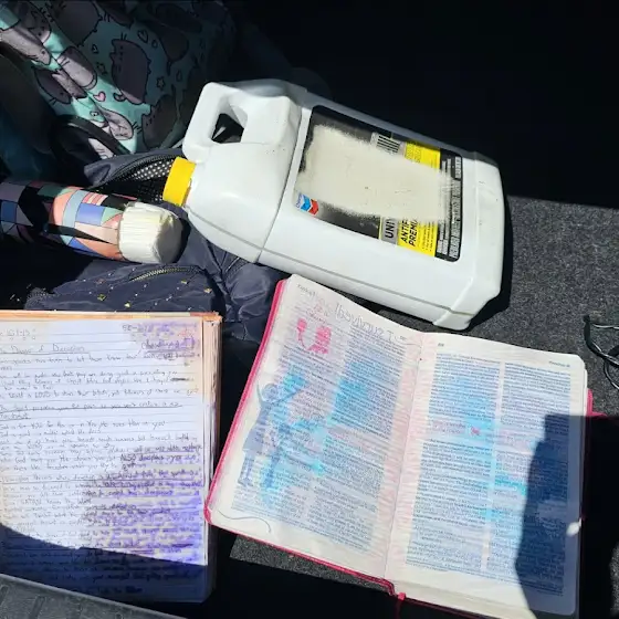 Notes aaannddd and attack from the enemy- Antifreeze in the back of my car with a REALLY secure cap got ONLY all over my church bag and damaged my Bible, notes and everything inside. It's no coincidence that out of all the stuff inside, only my Bible bag was affected (soaked I'mnot kidding had to sit in service with even touching it would soak my fingers), but the enemy won't win. I am prepared and will continue to spread His Gospel my way π§‘