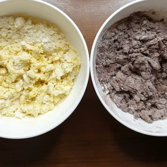 Далее вручную немного замесить светлое тесто. При необходимости обработайте руки небольшим количеством муки и сформируйте шарик. То же самое сделайте с темным тестом. Оба теста покрыть пленкой и поместить в холодильник на 30-40 мин.