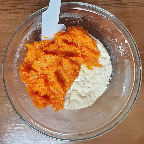 Оставляем для подьма на 1 час. Затем добавляям в тесто тыквенное пюре комнатной температуры и хорошо перемешиваем. Добавляем оставшуюся муку, воду, масло, мелкую соль и месим тесто руками несколько минут, пока не сформируется гладкий шар (при необходимости можно добавить немного муки). Накрываем миску пищевой пленкой и оставляем для подьма на 2 - 3 часа. Тесто должно утроится в объеме.