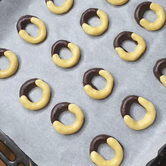 4. собирая колечки один за другим, размещайте их на противень, покрытый пергаментной бумагой.