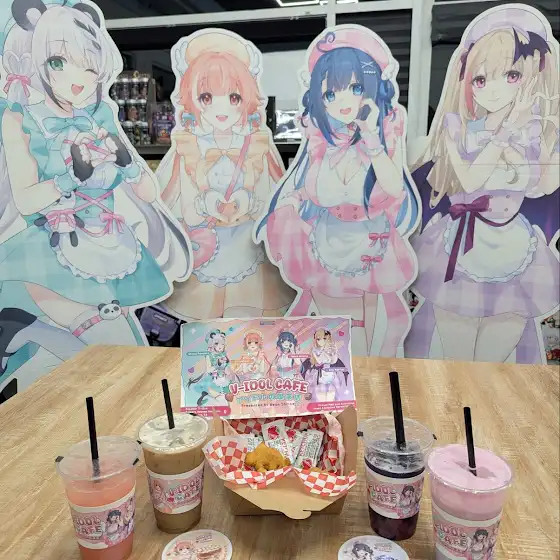 Exclusive V-Idol Cafe merch is now available to get online!!! Acrylic stand, digitally signed cheki, and a super sparkly can badge to support your tenshi meido!!! ପ(๑>ᴗ•๑)ଓ ♡ store.neonshrine.shop/collections/v-idol-cafe