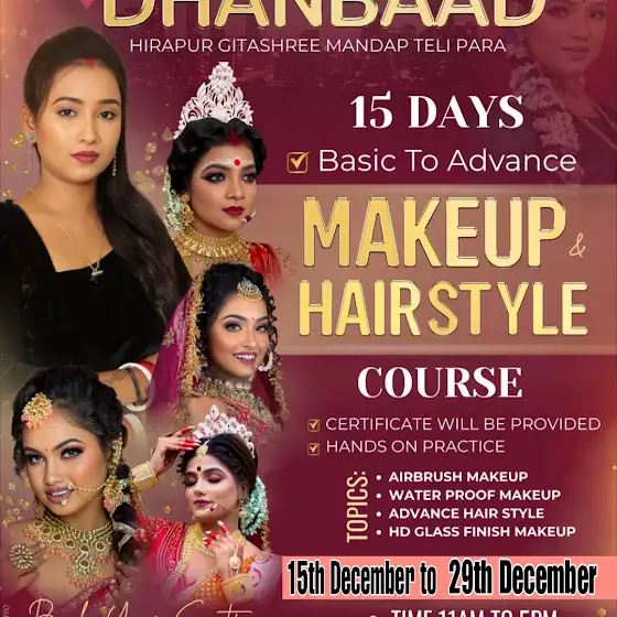 πππCourse details πππ ___ π international product knowledge π how to handling tools π complete theory π understanding skin type and texture / issues π how to select proper base π color correcting theory π blush, contour, highlight technique π eyebrows correcting π lip draw π eyeliner πππ Demonstration πππ π Bengali Bridal π Reception Makeup π non Bengali / Muslim bride π Haldi π Party Makeover π Self makeup π hair style ( basic to advance) π front variation π Saree draping π lehenga draping π eye makeup ( basic to advance) π΄ total 1οΈβ£5οΈβ£ days class π΄π’π’Learn professional makeup