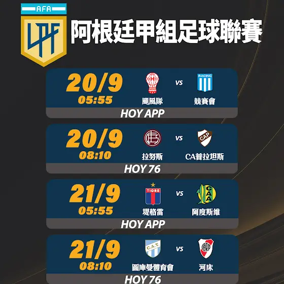 阿根廷甲組足球聯賽 - 颶風隊 對 競賽會 9月20日 05:55|HOY APP