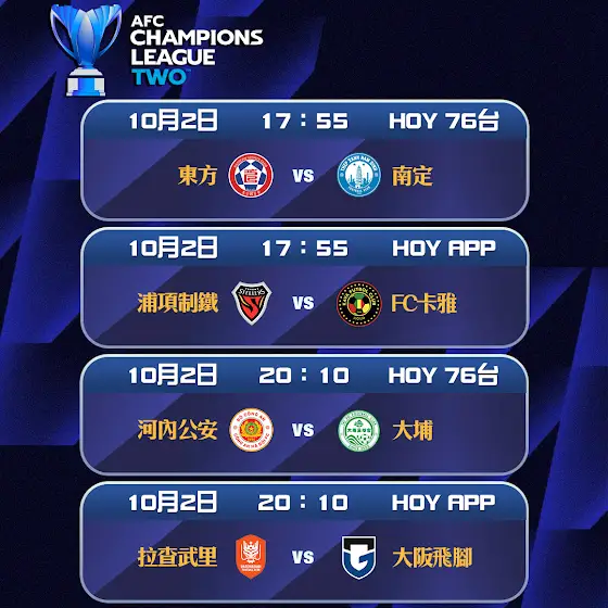 亞洲聯賽冠軍盃二級聯賽 - 東方 對 南定 10月2日 17:55|HOY 76台