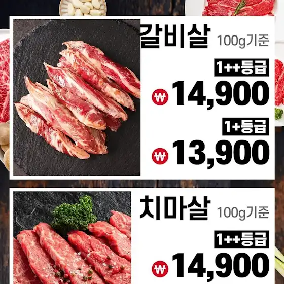 ▶갈비살 1++등급 100g 기준 14,900원