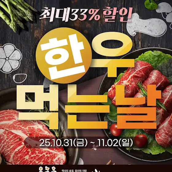 ★한우먹는날 맞이 할인행사!!★pf.kakao.com/_ppYSxb/111227259행사기간 : 2025년 10월 31일(금) ~ 11월 02일(일) / 3일간할인품목 최대 33% 할인!!▶ '울산축협한우 유튜브' 구독하고 다양한 소식 받아보세요!(★유튜브쇼핑에서도 편하게 구매 해보세요★)youtube.com/channel/UCuvC8r_R...* 팝업창이 뜨면 하단부에 YouTube 열기를 눌러서 접속해주세요 *고객님들의 많은 방문 부탁드립니다!★행사상품 목록★▶갈비살 1++등급 100g 기준 14,900원▶갈비살 1+ 등급 100g 기준 13,900원▶치마살 1++등급 100g 기준 14,900원▶치마살 1+ 등급 100g 기준 13,900원▶부채살 1++등급 100g 기준 11,900원▶부채살 1+ 등급 100g 기준 10,900원▶안심 1++등급 100g 기준 12,900원▶안심 1+ 등급 100g 기준 11,900원▶채끝 1++등급 100g 기준 12,900원▶채끝 1+ 등급 100g 기준 10,900원▶등심 1++등급 100g 기준 11,900원▶등심 1+ 등급 100g 기준 9,070원▶양지 전등급 100g 기준 4,270원▶불고기 전등급 100g 기준 3,030원▶국거리 전등급 100g 기준 3,030원▶한돈 항정살 100g 기준 4,500원▶한돈 등심덧살 100g 기준 3,500원▶언양식 석쇠불고기 600g 1팩 20,000원▶한우냉동고기곰탕 1kg 1팩 5,000원*본 행사품목은 조기 소진 될 수 있으므로 가까운 매장에 문의 바랍니다.*행사품목 소진 시 행사 조기 종료