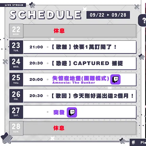 【0915-0921週表】 周三又要來帶小孩😃 本周日有第一次的烤棉花糖 這次是開放問任何問題的! 棉花糖投稿 : reurl.cc/9nqXgx 原創曲 雨愛平行 : reurl.cc/nYq5nD LiveTag : #昴片 Fan Art : #昴咪 NSFW : #偷喵一眼 Meme : #咪咪昴昴 與我分享 : #昴盯