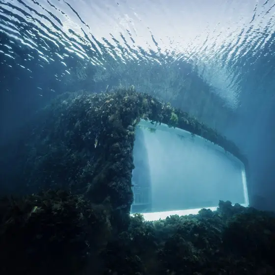 Snøhetta는 언더 건설 당시 '자연과 포용' 슬로건을 제시했습니다. 수중 독립 건축물이 아닌 자연과 하나가 되는 것을 의도한 것인데요. 이를 위해 콘크리트 외벽을 거칠게 마감했습니다. 가다랑어와 다시마가 이곳에 자리 잡았고 언더는 하나의 인공 암초가 됐습니다. 현재 다양한 조류와 연체동물이 서식하고 있으며 수많은 홍합이 물을 정화하고 있습니다.
