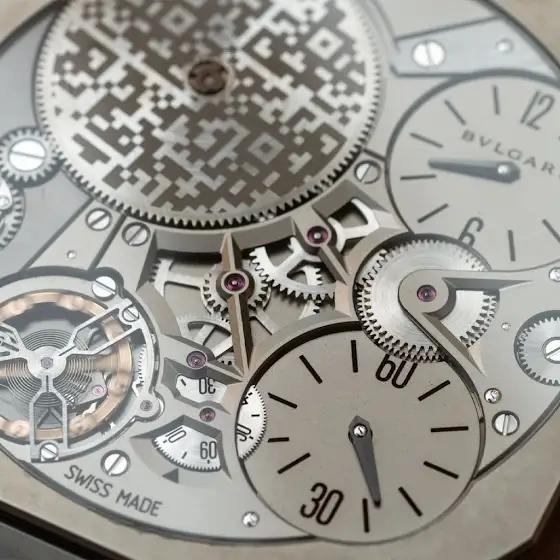 케이스는 팔각형 형태로 디자인됐습니다. 효율적인 구성을 위해 특정 부품은 4가지 기능을 수행하도록 설계됐습니다. 좌측 상단에는 NFT 아트워크 및 메타버스에 접속할 수 있는 QR 코드가 새겨졌습니다. 이에 불가리는 “기계적인 세계와 디지털 공간의 연결”이라고 밝혔습니다.