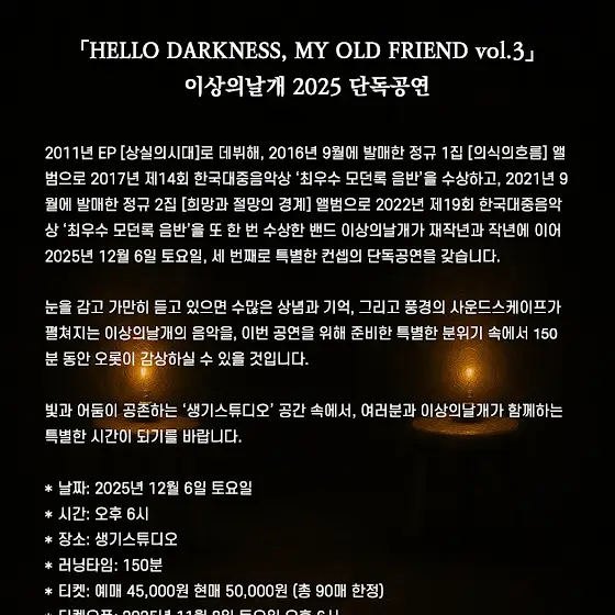 덧붙여, 다시 한번 공지드리자면 3년째 이어지는 어두운 다락방 같은 곳에 조촐하게 모여 작은 불을 켜놓고 눈보다는 귀로 듣는 것에 초점을 맞춘 이 특별한 컨셉의 공연은 당분간의 마지막 공연이 될 예정입니다. 내년부터는 본격적으로 3집 작업에 들어갈 예정이라 언제 다시 단독공연을 하게 될지도 기약이 없으니, 긴 시간 동안 오롯이 저희 이상의날개의 음악과 함께 하고 싶은 분들은 이번 공연에 함께 해주시기 바랍니다.