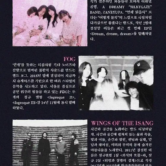 Debuting in 2011 with the EP [Lost], Wings of the ISANG won Best Modern Rock Album at the 14th Korean Music Awards in 2017 with their first full-length album [Stream of Consciousness] (released in September 2016).