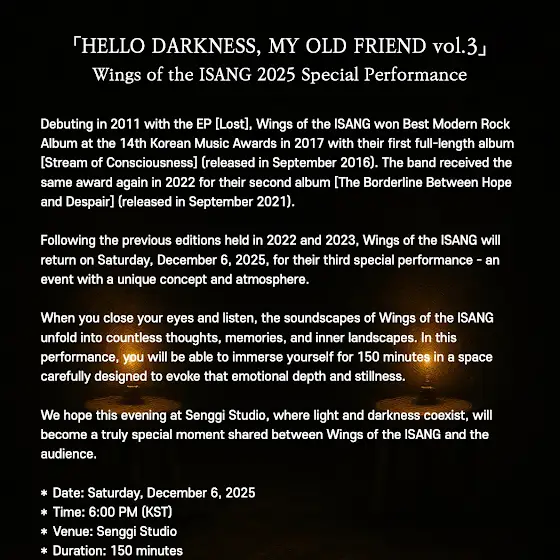 As a reminder, this special concept gig—gathering in a cozy, dimly lit attic-like space for the third year, focusing on listening with your ears rather than seeing with your eyes—will be the last of its kind for the time being. From next year, we’ll be fully immersed in creating our third album, so we cannot promise when we’ll hold another solo gig. For those who want to spend a long, uninterrupted time fully immersed in Wings of the ISANG’s music, we hope you’ll join us for this performance.