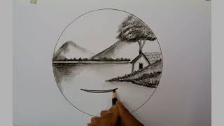 Scenery Drawing Easy For Beginners With Pencil in a Circle Step By Step/ Circle Scenery Drawing Easy