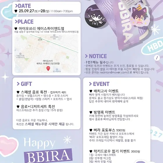 2025년 9월 27일 저의 생일을 맞아서 팬 분들이 모일 수있는 생일 카페를 열고자합니다.