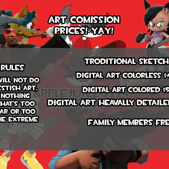 Hi, I'm AppleJuice0324, I joined YouTube maybe on Aug 31, 2016, I'm a Spanish American who's a Cartoonist, Furry Artist, Animator/Filmmaker, Furry, and Weeb that has ADHD Asperger’s, on the Autism Spectrum, Self diagnose with PTSD. I'm a Sonic The Hedgehog & Team Fortress 2 fan, I makes Action Packed, Comedy, Lesbian Romance SFM animations, 2D&3D animations with a Funny Loony Toony gag humor. I releases Trailers on Thursdays, Film Projects on Fridays, live lets plays on Saturdays, and other content on weekdays. Also my content is not made for kids!