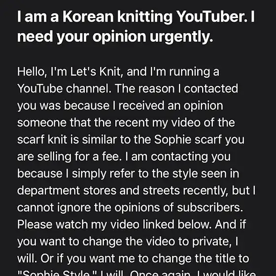 안녕하세요. 레츠뜨개입니다 커뮤니티의 첫 게시글이 유쾌한 이야기가 아니라서 속상하네요저 나름 첫 커뮤글에 대한 로망이 있었거든요 ;;;아무튼 본론으로댓글에도 알려드렸듯 저는 그저 길거리에 기계니트 느낌의 간편한 목도리를 보고아이와 어른이 함께 할 수 있고,초보도 뜨개질하면 겉뜨기부터 시작하니겉뜨기를 최대한 이용한 작품을 만들어보자~!!라는 생각끝에 나온 작품으로 쁘띠니트님의 도안은 본적 없습니다그러나 일단 더 이상의 논란을 원치 않기에제가 할 수 있는 방법을 동원해서 쁘띠니트님께 DM 및 메일을 남겼고조금만 기다려달라는 메일을 받았습니다메일 내용과 답변내용은 아래와 같습니다답변이 오는대로 커뮤에 알리겠습니다감사합니다