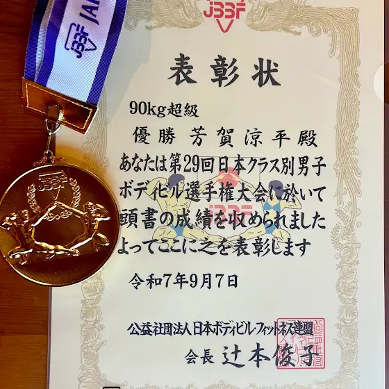 日本クラス別ボディビル選手権 90kg超級、優勝しました🏆通算3度目の優勝です!残念ながらエントリーは1人でしたが、見据えてるのは日本選手権なので全力で調整して挑みました