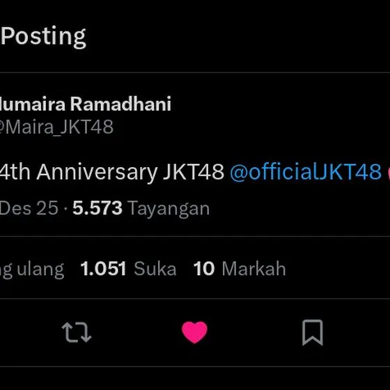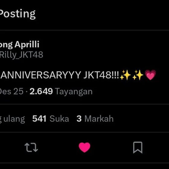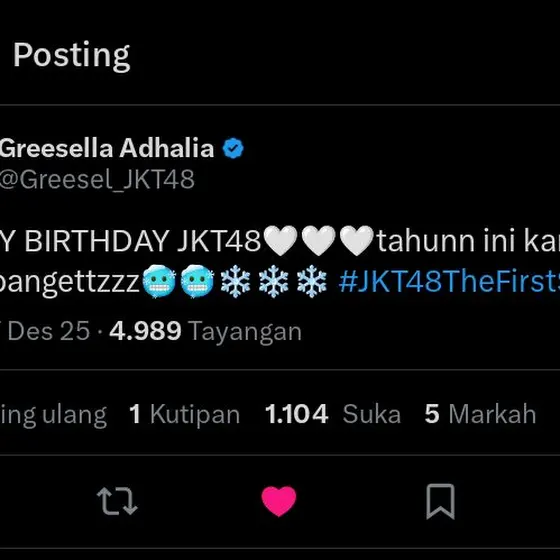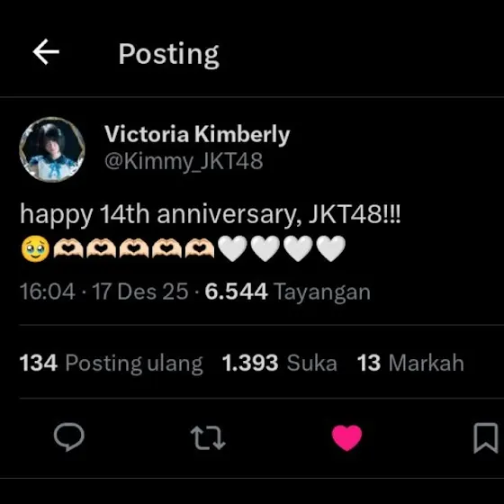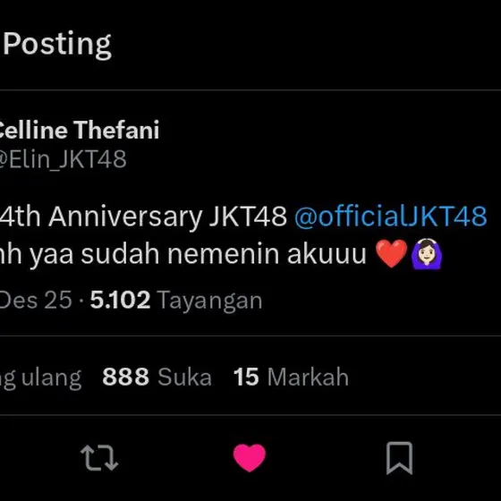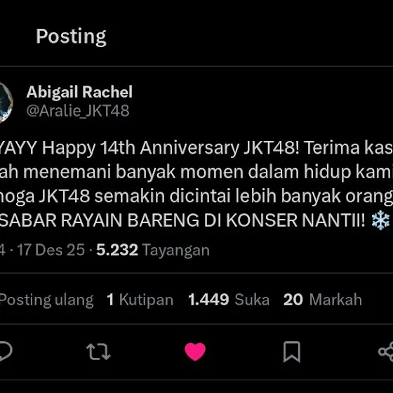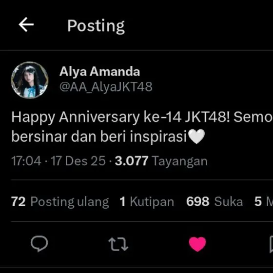 (1) HAPPY 14 TH ANNIVERSARY JKT48🎉 Semoga kedepannya bisa lebih mengerti kondisi dan keadaan para member, dan tolong management nya diperbaiki lagiiMungkin sgtu saja saran untuk kedepannya, selebihnya terimakasih sudah hadir di kehidupan yang cuma sekali ini🤍