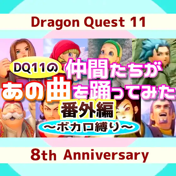 ドラクエ11の『さそうおどり』動画の番外編を投稿しました! ⇒https://youtu.be/Boitl6DFQMM 先日イルルカのキャラ達がボカロ曲を踊る動画を投稿して、ドラクエ11のキャラでもやってみようと思い、勢いで作りました!笑 できる限りメジャーなボカロ曲を選びましたので、ぜひ楽しんで観ていただければ幸いです。 7月29日はドラクエ11の発売日だそうです。ドラクエ11、8周年おめでとうございます! 過去作(仲間たちがあの曲を踊ってみたシリーズ) ⇒www.youtube.com/playlist?list...