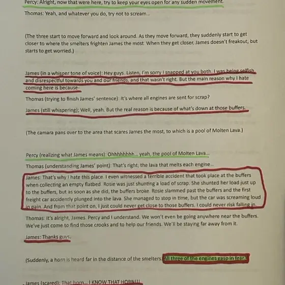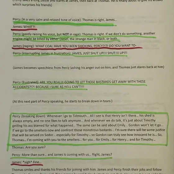 Here are some more lines for @tylerthetankengine2699 as the voice of James, and more lines for @Superlegomatt240 as the voice of Percy. These lines are for Episode 5 of the special that is still in the works.