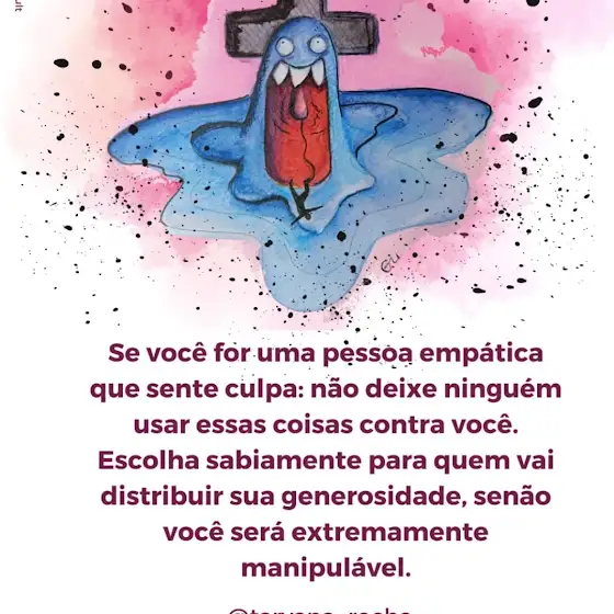 Por isso: fique especialmente atento às pessoas que dizem: "meu sofrimento é sua culpa e se você não fizer o que eu quero você é uma má pessoa." Essa atitude é um marco CLÁSSICO de personalidades controladoras e antagonistas. Proteja-se sendo maior, mais lúcido e mais corajoso do que sua culpa! Só assim você protege a si mesmo e àqueles que dependem de você, com crianças e animais.