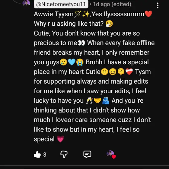 Sissy 😌 You won't believe it 🫶 I cried after receiving this reply from you 🥹 I'm also a sissy like you 😫 I really love you guys so much ❤️🩹🎀 I can't explain how much I love you. You are my only friend. You are the reason for my smile. When you give me nice comments, I am so happy that I can't explain it in words. 🙌✨🥹 @JEON_LAMIY-ot7 @Miss_melodie_33 @Miss_jenniexৎ @˗ˏˋ 𝗡𝗶𝗰𝗲𝘁𝗼𝗺𝗲𝗲𝘁𝘆𝗼𝘂 ˎˊ˗ @Nai_the_cutiepie @girly_jeru @sajeeshkanneri9837 @Savage_woman @Sooya-97 @You~😌✨