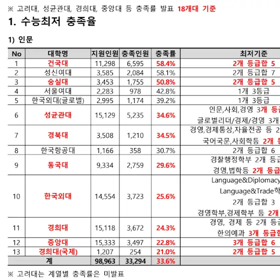 올해 수능이 어려웠기 때문에 (특히 영어) 최저 충족율은 더 떨어질 것으로 예상되기