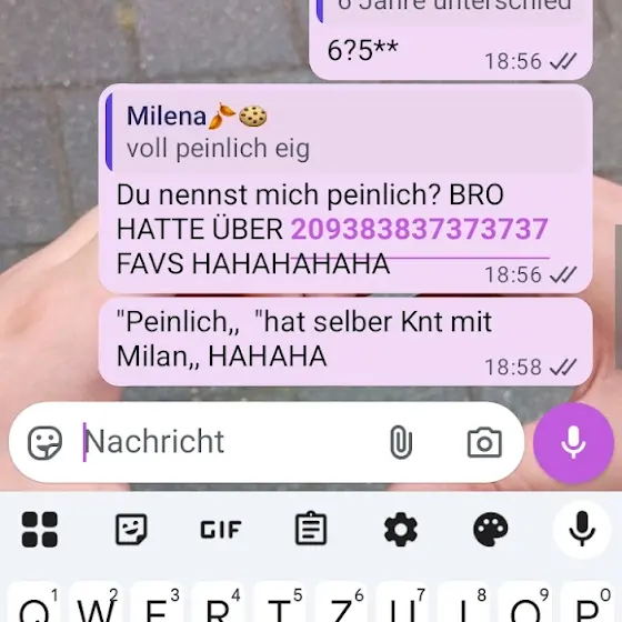 Und dann hat er mir auf pans nd mehr geantwortet. Hab dann Milena gefragt und hab 2 milans auf pans (sind beide andere Personen.) einen kenn ich irl und der andere ist @esaym1lan und sie hat dann gesagt "hast du ihn nd hs genannt?,, dann sagte ich ja kenne zwei aber beide antworten nd und dann sagte sie eig peinlich und sonst was, dann sagte ich wrm dann sagte sie auf einmal "6 Jahre Unterscheid beim alter,, was nd stimmt ganz ehrlich es ist Internet mein Gott, ja Leute ich bin am 16.10 10 geworden und? Das sind glaub nur 4 Jahre Unterscheid und selbst wenn? Ich hab kein crush auf ihn oder sonst was,ich finde Internet bzh peinlich, und auf snap oder yt auch. Ich will sowieso kein freund, und dann ja, hab ich mich mit Milena iwi gestritten weil sie Drama gesucht hat. Dann hab ich geschrieben "nennst mich peinlich aber hatte 0273373828283 Favs HAHAHA,, oder so und noch irgendwas. Dann haben wir gestritten ist eskaliert und ja. Kommen wir Mal zum sm Thema. Ich habe nie sm vorgetäuscht!. Ich hab es schon oft versucht oft schief gelaufen.