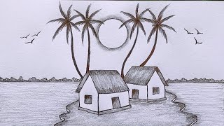 How to draw a scenery of village with pencil step by step || Village scenery drawing ||Pencil sketch