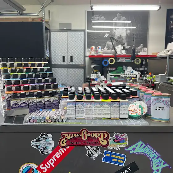 You’re looking at AlphaFlex paint (for hand painting), AlphaAir paint (for airbrushing), Alpha 6 Paint Markers, Alpha 6 display case, Alpha 6 Cleaners, Preparers, Finishers and their new Soul Tape!