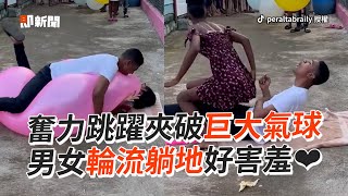 男女輪流躺地「夾破巨大氣球」 互動親密超害羞😚|團康遊戲|朋友|生活