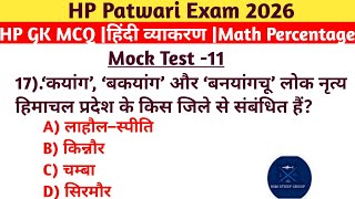 HP Patwari Exam 2026| HP GK MCQ + हिंदी व्याकरण + Math Percentage |Mock Test#10 | #Hppatwariexam2026